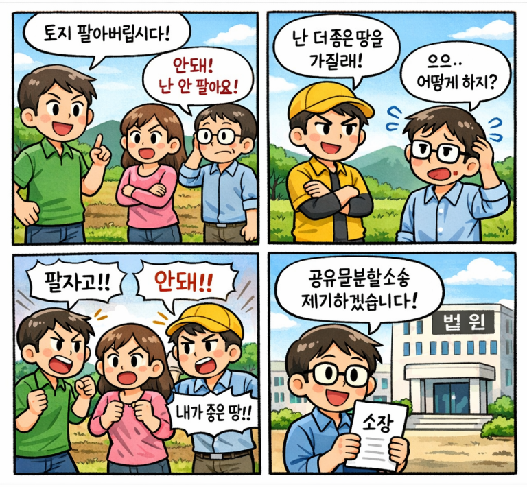 공유물분할소송이란 하나의 부동산(토지, 건물)을 여러 사람이 지분으로 공동 소유(공유) 하고 있는 경우,